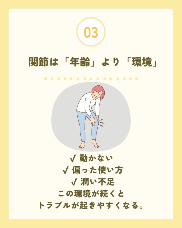 「歳のせいかな…」と思いがちですが、実は関節のトラブルは年齢よりも「環境」の影響が大きいんです。