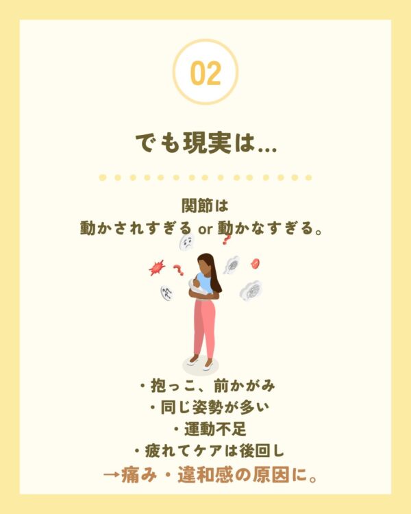 - 同じ姿勢が多い(授乳、デスクワークなど)
