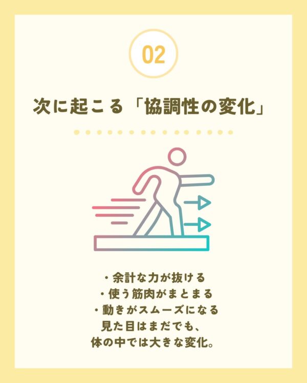 神経系の適応が進むと、次に起こるのが「協調性の変化」です。