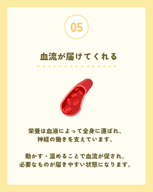 栄養を全身に届けているのは**血液(血流)**です。血液が全身をめぐることで、神経が必要としているエネルギーや材料がきちんと届けられます。