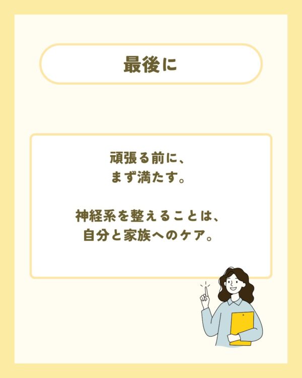 神経系を整えることは、自分へのケアであり、家族へのケアでもあります。