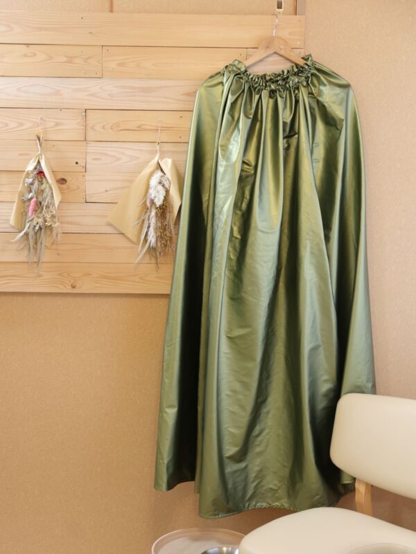 サロン内装の写真。木の壁にドライフラワーが飾られ、よもぎ蒸し用のグリーンのマントがハンガーに掛かっている実物写真