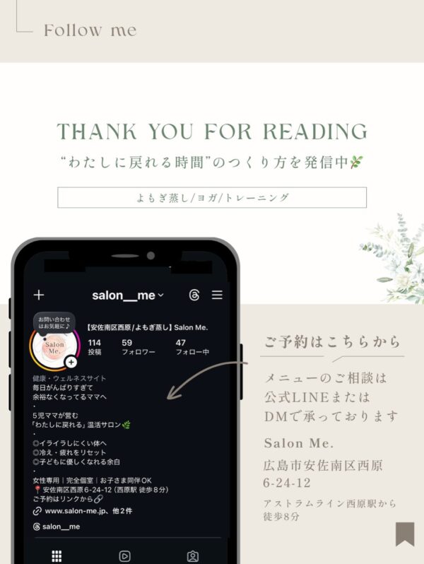 「THANK YOU FOR READING」の見出し、Instagramプロフィール画面のモックアップ、サロン住所・予約案内が載った緑×ベージュのまとめ画像