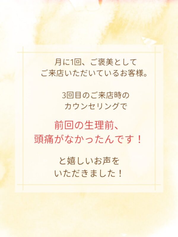 月に1回、ご褒美としてご来店いただいているお客様。3回目のご来店時のカウンセリングで 前回の生理前、頭痛がなかったんです! と嬉しいお声をいただきました!」と書かれた黄色い水彩背景のテキスト画像(「前回の生理前、頭痛がなかったんです!」の部分が赤文字)