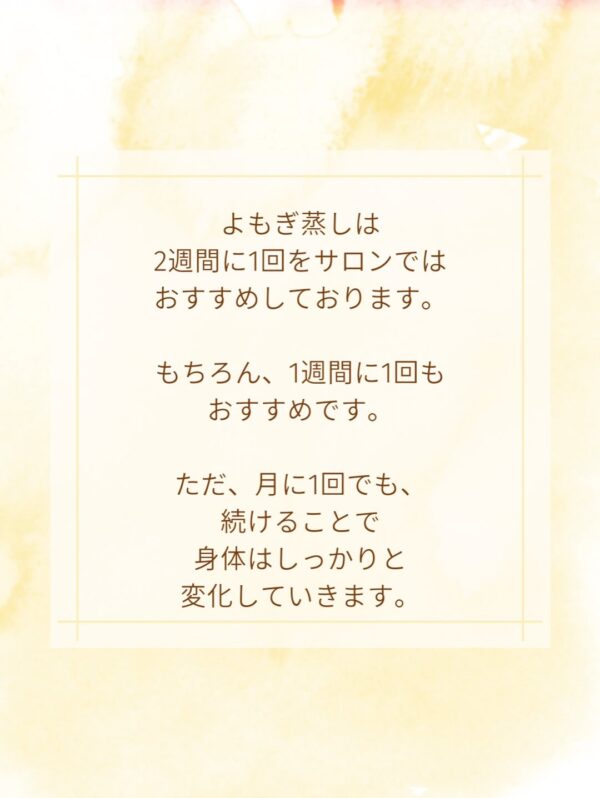 「よもぎ蒸しは2週間に1回をサロンではおすすめしております。もちろん、1週間に1回もおすすめです。ただ、月に1回でも、続けることで身体はしっかりと変化していきます。」と書かれた黄色い水彩背景のテキスト画像