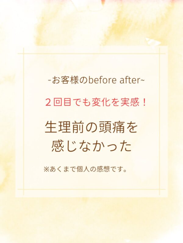 お客様のbefore after- 2回目でも変化を実感! 生理前の頭痛を感じなかった ※あくまで個人の感想です。」と書かれた黄色い水彩背景のテキスト画像