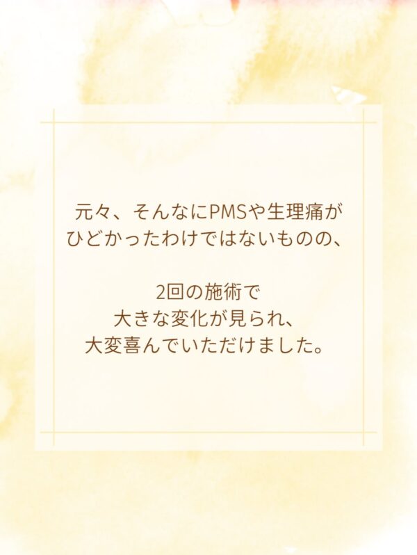 元々、そんなにPMSや生理痛がひどかったわけではないものの、2回の施術で大きな変化が見られ、大変喜んでいただけました。」と書かれた黄色い水彩背景のテキスト画像